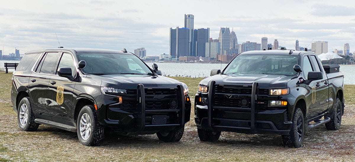Two patrol trucks with Detroit skyline About